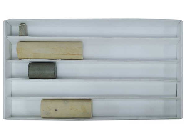 Las cajas para testigos de perforación, incluyen bases, tapas (la diferencia entre ellas es de 2 cm) y divisiones (5 divisiones HQ por caja).