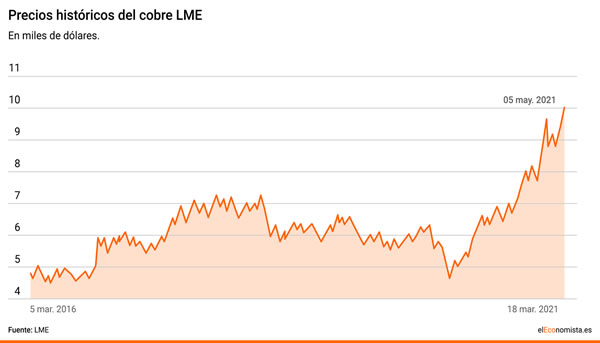 El cobre está viviendo un rally impresionante. Con una revalorización de más del 25%, este metal industrial ha alcanzado los 10.000 dólares por tonelada en los últimos días, tras empezar el año en la zona de los 7.800 dólares por tonelada. La demanda está rebasando a la oferta, creando escasez de concentrado de cobre, que es lo que usan las fundidoras para crear el metal que más tarde se usa en la fabricación de coches, trenes, motores.