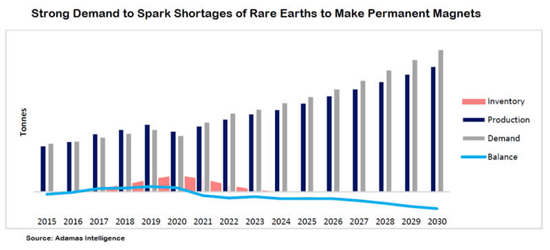 A pesar de que la pandemia ha afectado las ventas de automóviles, la demanda de estos imanes en vehículos eléctricos se disparó un 35% solo el año pasado a 6.600 toneladas, dice Adamas Intelligence.